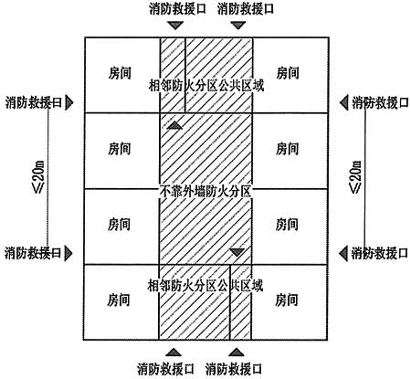28.厂房、仓库和商店建筑的每个防火分区至少应设置两个直通走道、公共区域(可利用公共卫生间、楼梯间及前室的开口)或大空间区域的消防救援口。(附图28.1)