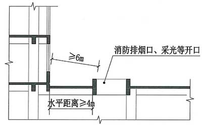 (3)当建筑局部突出物或相邻建筑的外墙高于“步行街”顶棚部分采用防火墙和耐火极限不低于1小时的屋面板时,“步行街”顶棚与上述外墙距离不限;当上述外墙高于“步行街”顶棚部分设置门窗洞口时,“步行街”顶棚与上述外墙距离不小于6m,排烟口与上述外墙距离不小于9m。