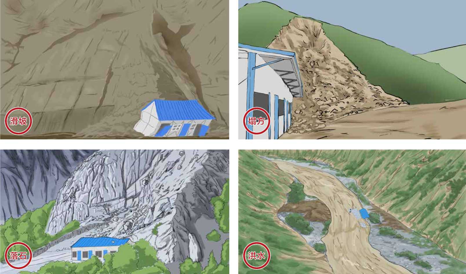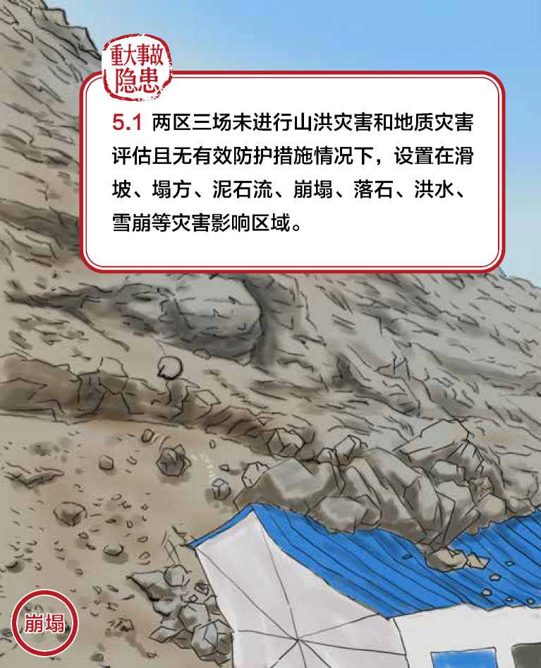 (一)两区三场未进行山洪灾害和地质灾害评估且无有效防 护措施情况下,设置在滑坡、塌方、泥石流、崩塌、落石、洪水、 雪崩等灾害影响区域;