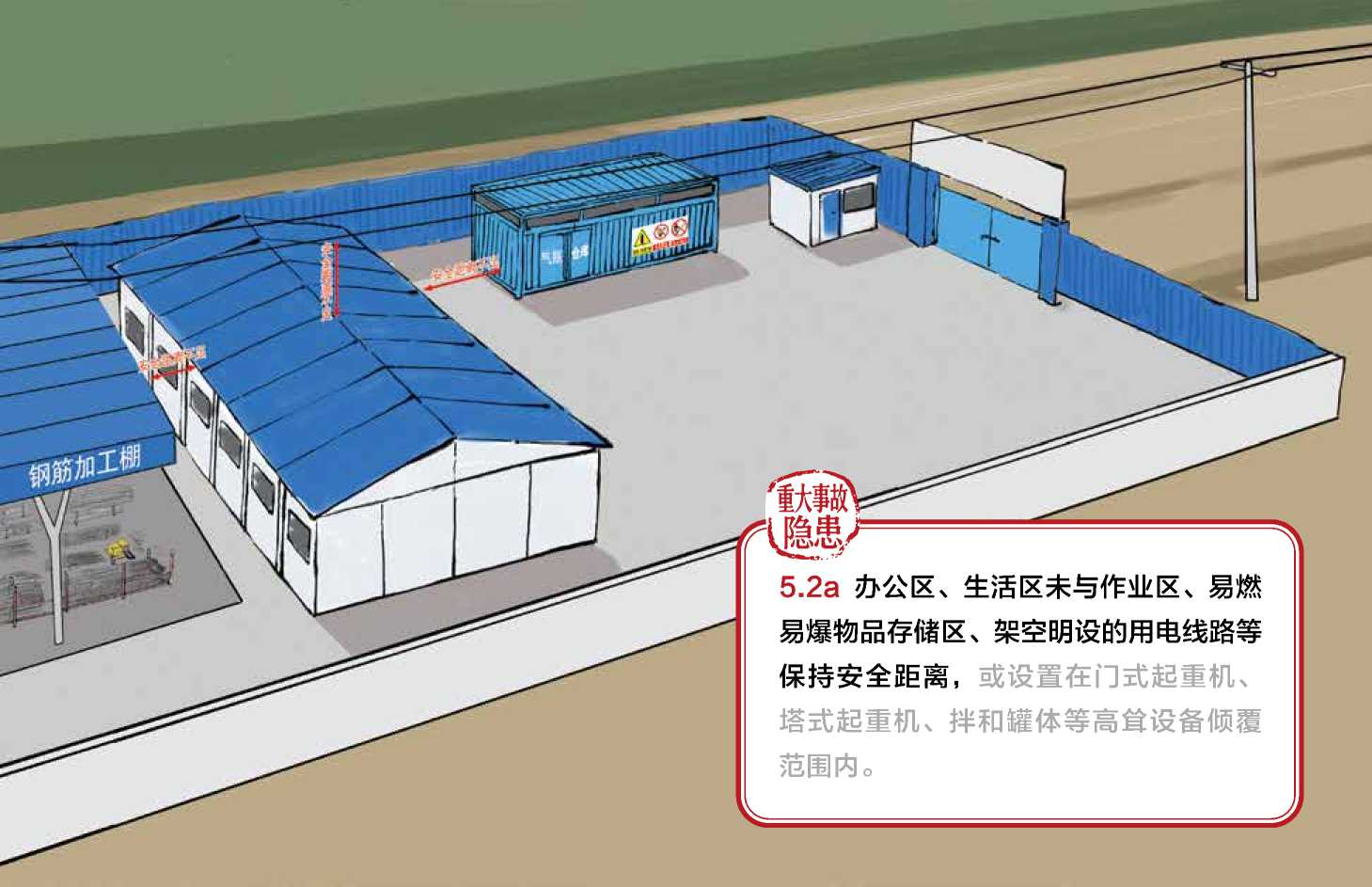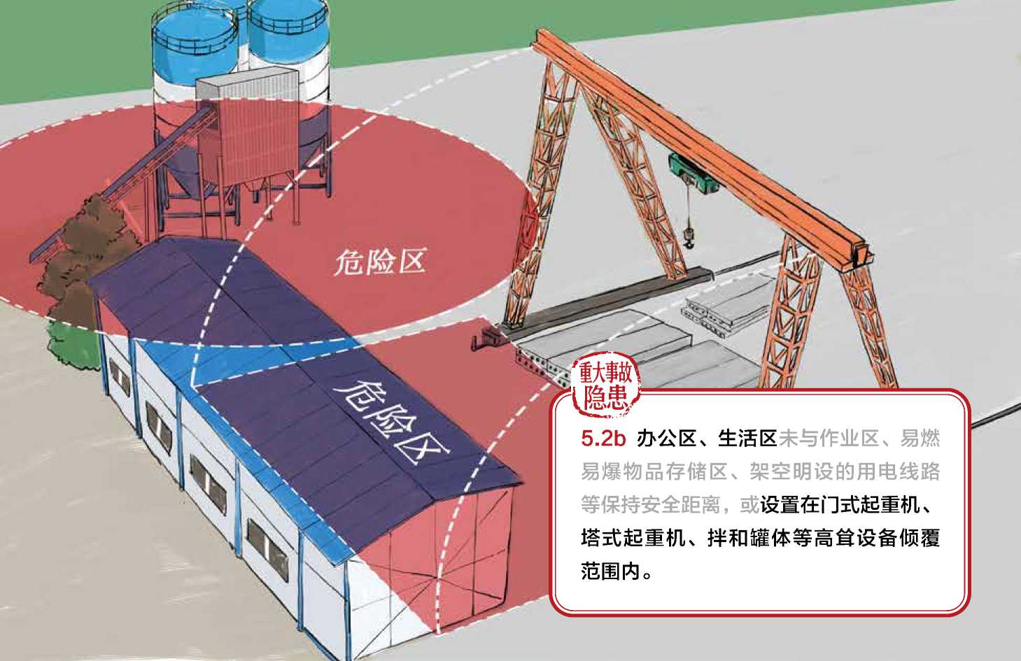 (二)办公区、生活区未与作业区、易燃易爆物品存储区、 架空明设的用电线路等保持安全距离,或设置在门式起重机、塔 式起重机、拌和罐体等高耸设备倾覆范围内。