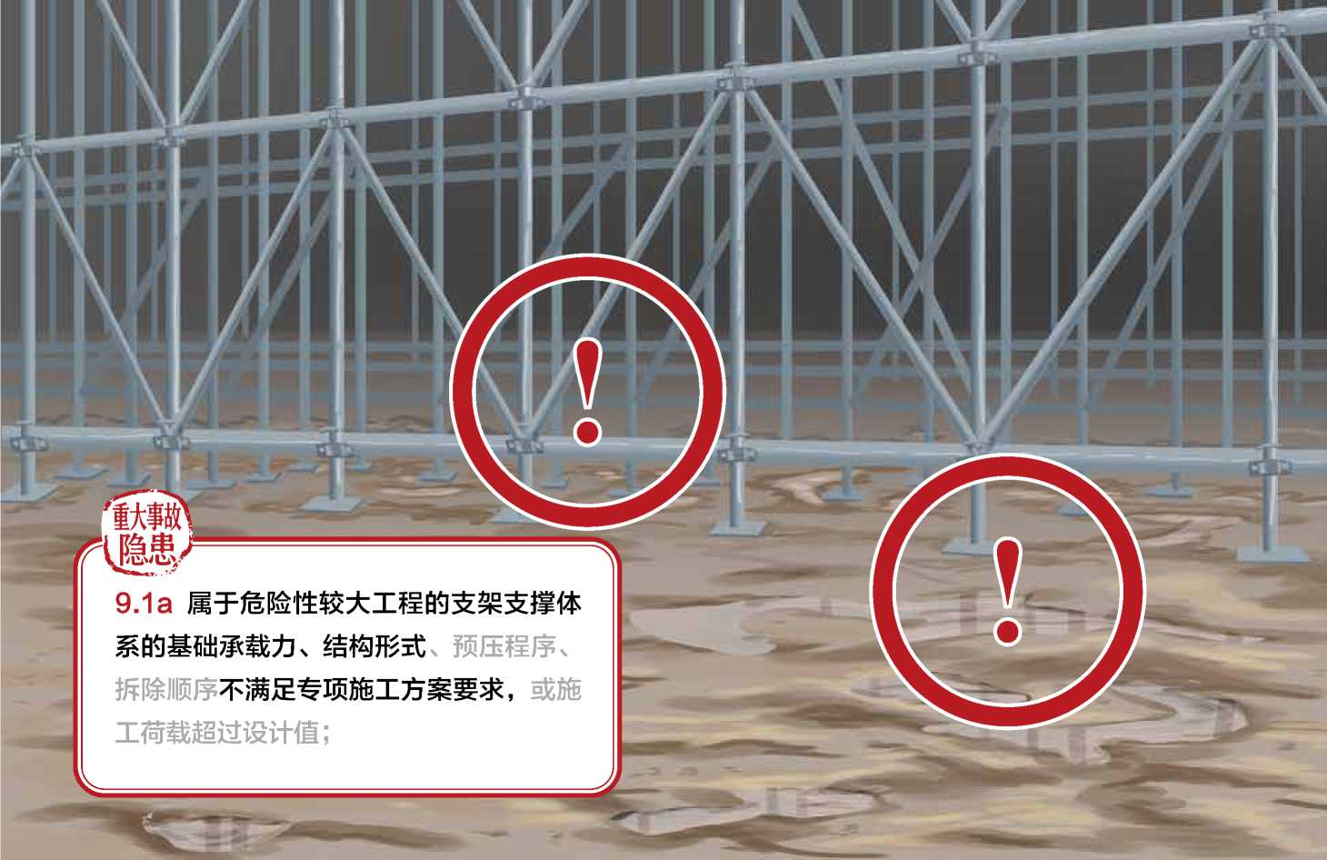 9.1b 属于危险性较大工程的支架支撑体 系的基础承载力、结构形式、预压程序、 拆除顺序不满足专项施工方案要求,或施 工荷载超过设计值;