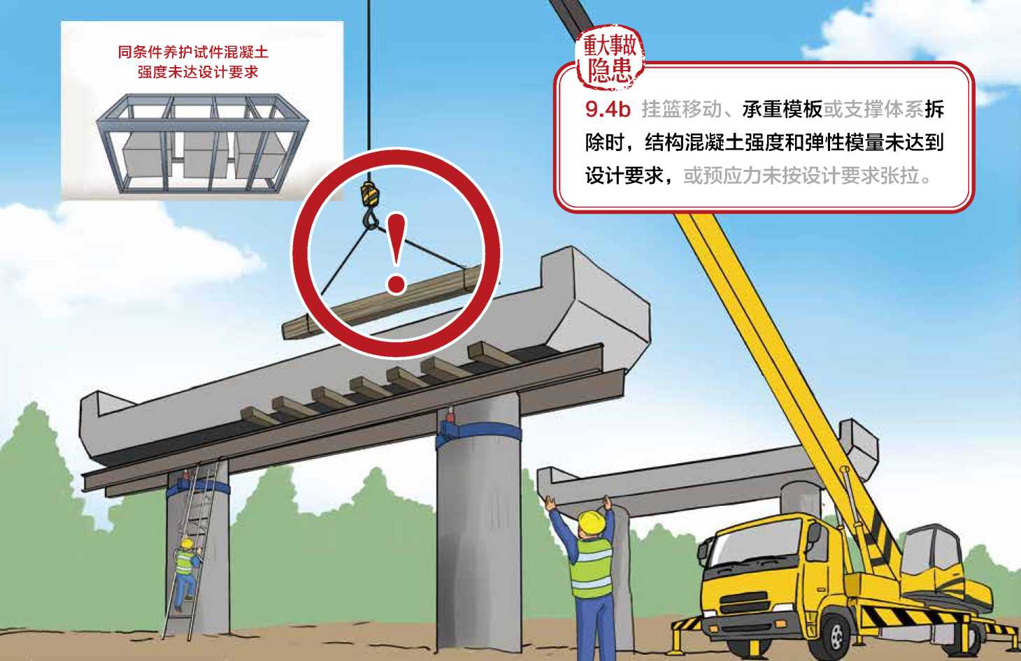 (四)挂篮移动、承重模板或支撑体系拆除时,结构混凝土 强度和弹性模量未达到设计要求,或预应力未按设计要求张拉。