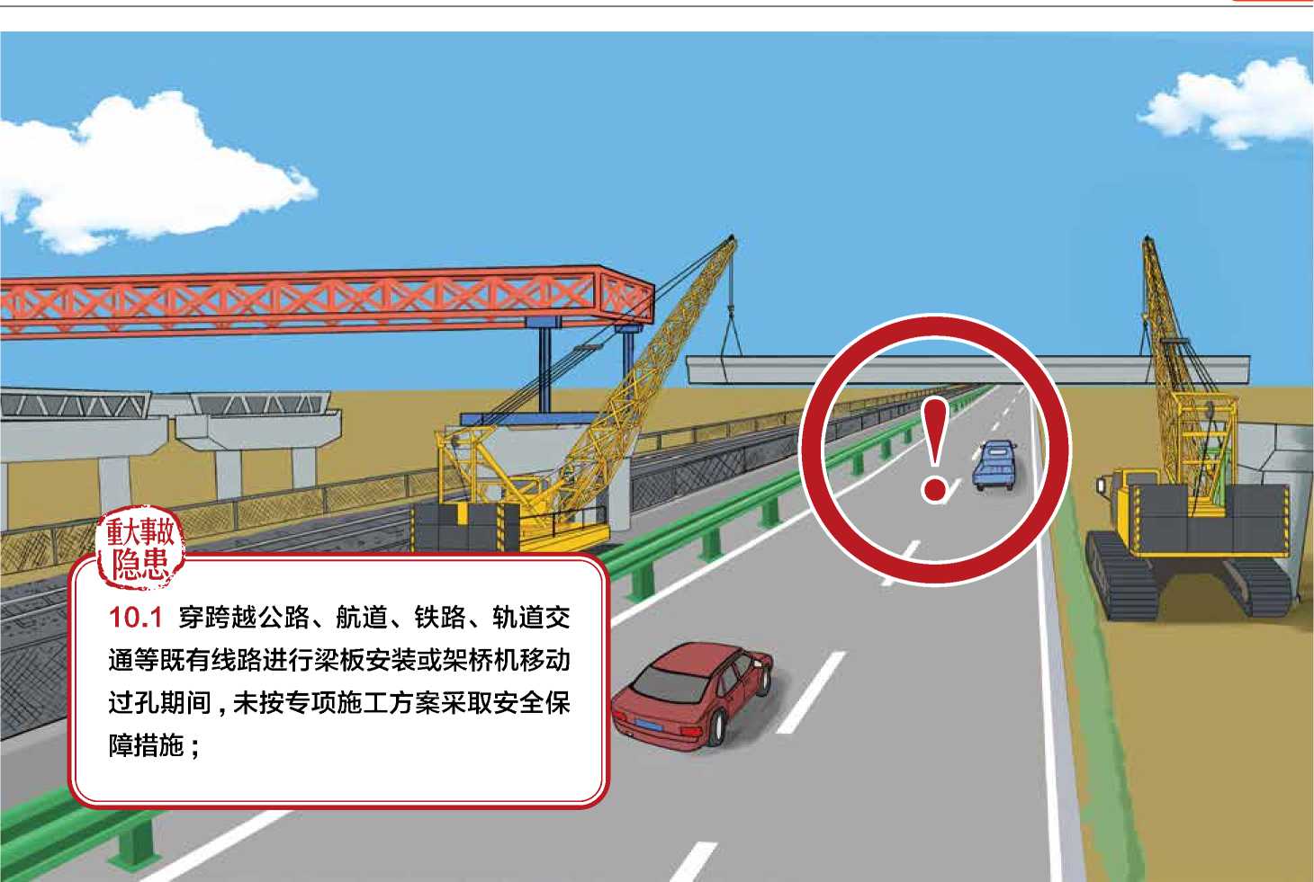 (一)穿跨越公路、航道、铁路、轨道交通等既有线路进行 梁板安装或架桥机移动过孔期间,未按专项施工方案采取安全保 障措施;