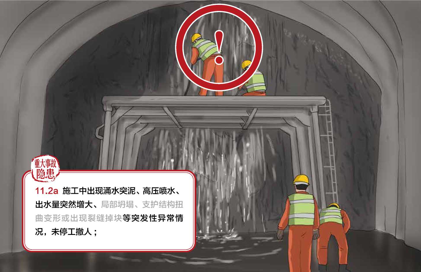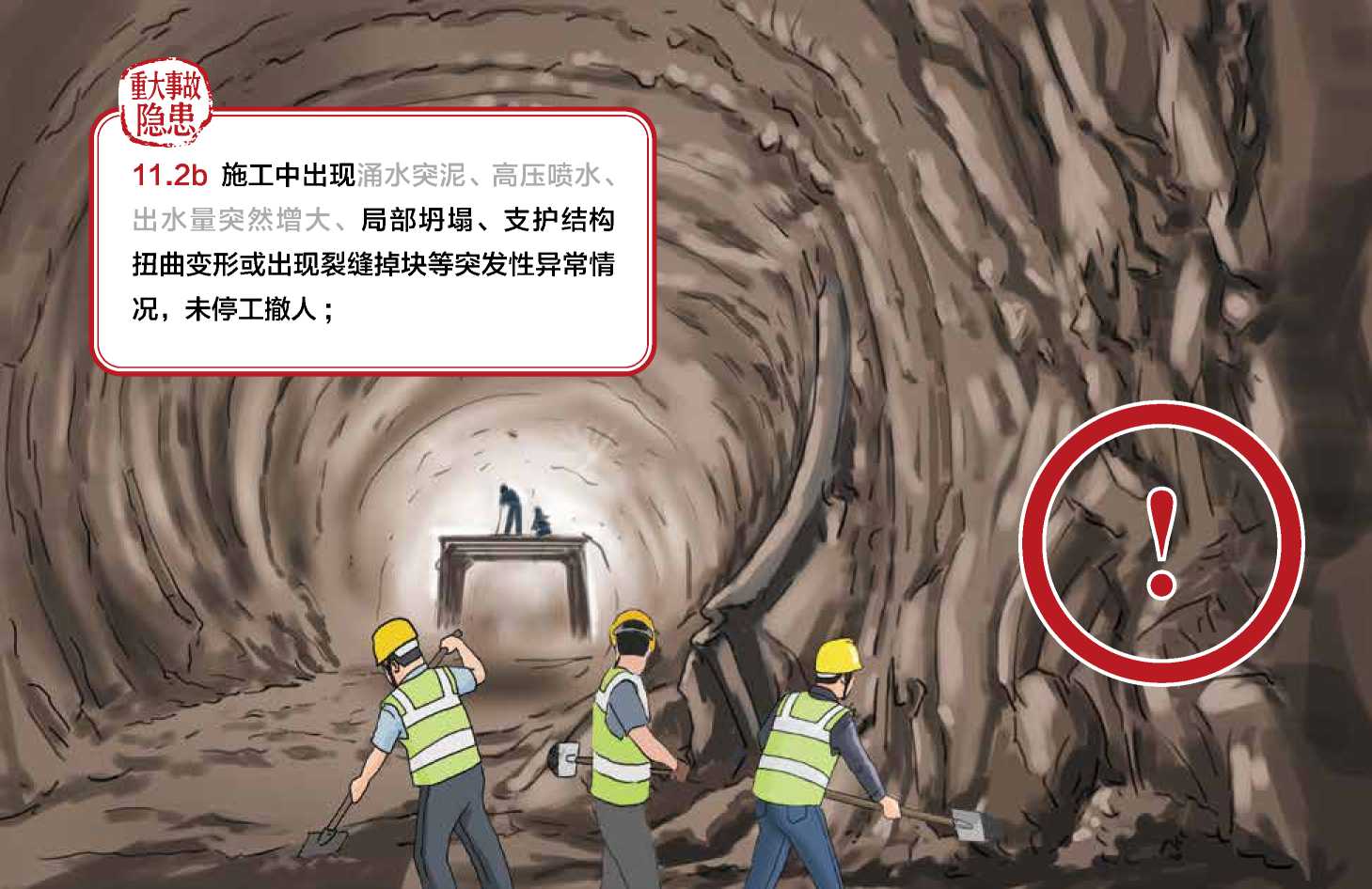 (二)施工中出现涌水突泥、高压喷水、出水量突然增大、 局部坍塌、支护结构扭曲变形或出现裂缝掉块等突发性异常情况, 未停工撤人;