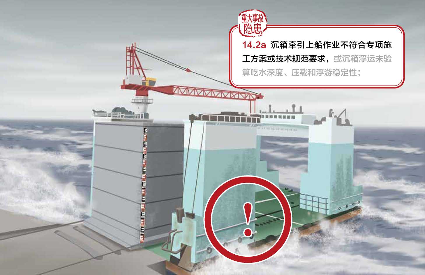 14.2a 沉箱牵引上船作业不符合专项施 工方案或技术规范要求,或沉箱浮运未验 算吃水深度、压载和浮游稳定性;