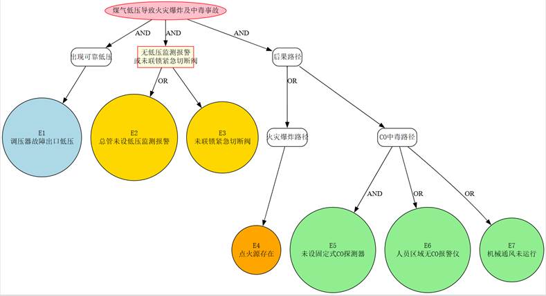 以“煤气/天然气低压导致火灾爆炸及中毒事故”为顶事件进行故障树分析 |