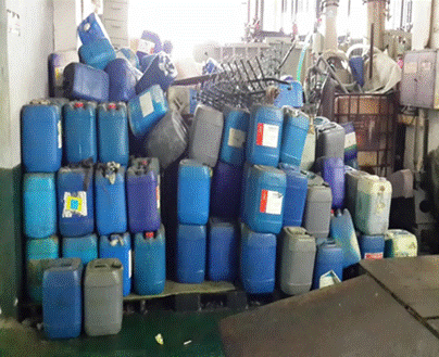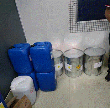 危险化学品在车间现场随意堆放,未入仓 |