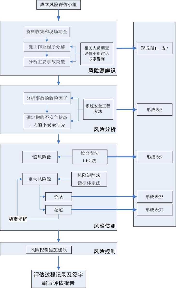 本《指南》分总体风险评估和专项风险评估两个层次。总体风险评估从桥梁或隧 道的工程规模、建设条件、技术难度等因素考虑,静态评估桥梁或隧道工程整体施工 安全风险大小。专项风险评估以具体施工作业活动为对象,从分析施工作业活动特点 入手,辨识常见事故类型,列出风险源清单,通过风险分析与估测,确定重大风险源, 并对重大危险源进行量化的动态评估。