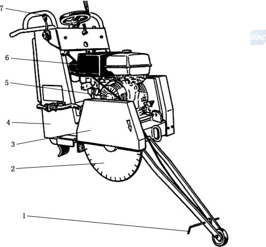 在施工现场用于混凝土、沥青和类似建筑材料地面的锯切、开槽和铁削的步行操控的移动式机械, 通常的组成部件如图1所示。