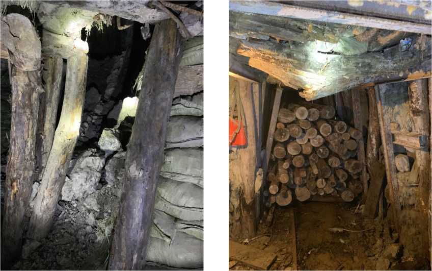 采场使用腐朽、蛀孔、软杂木和劈裂的坑木 进行支护 |