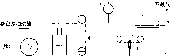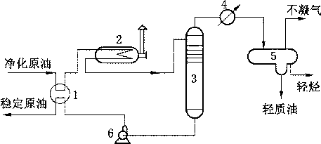 1一进料换热器;2—加热炉;3—稳定塔;4—冷凝器;5—三相分离器;6—塔底泵