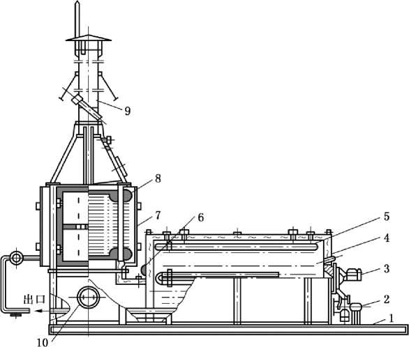 1—底座;2一风机;3—燃烧室;4一辐射室;5一辐射炉管;6一防爆门;7一对流室; 8—对流炉管;9一烟囱;10一人孔