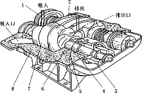 1一泵体;2一泵盖;3—叶轮;4一轴;5一双吸密封环;6一轴套;7一填料套;8一填料;