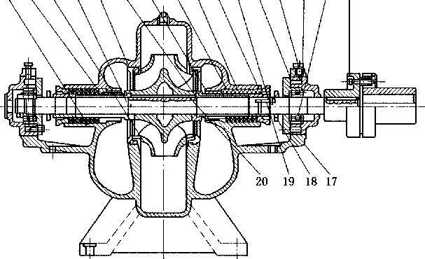 15—单列向心球轴承;16—联轴器部件;17—轴承端盖;18—挡水圈;19—螺栓;20—键 图1-7 S型双吸中开式离心泵结构