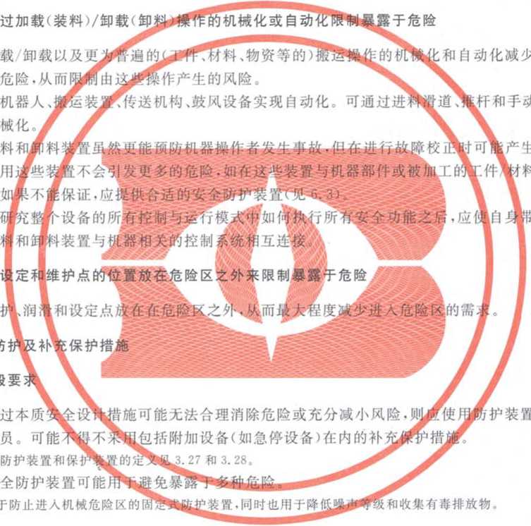 本标准规定了机械设计过程中用于实现机械安全的基本术语、原则和方法,以及风险评估与风险减 小的原则.以帮助设计者实现机械安全的目标。这些原则基于与机械有关的设计、使用、事件、事故和风 险的知识和经验。本标准还规定了在机器生命周期的相关阶段内进行识别危险、估计和评价风险的程 序,消除危险或充分减小风险的程序.以及记录和验证风险评估与风险减小程序的指南。
