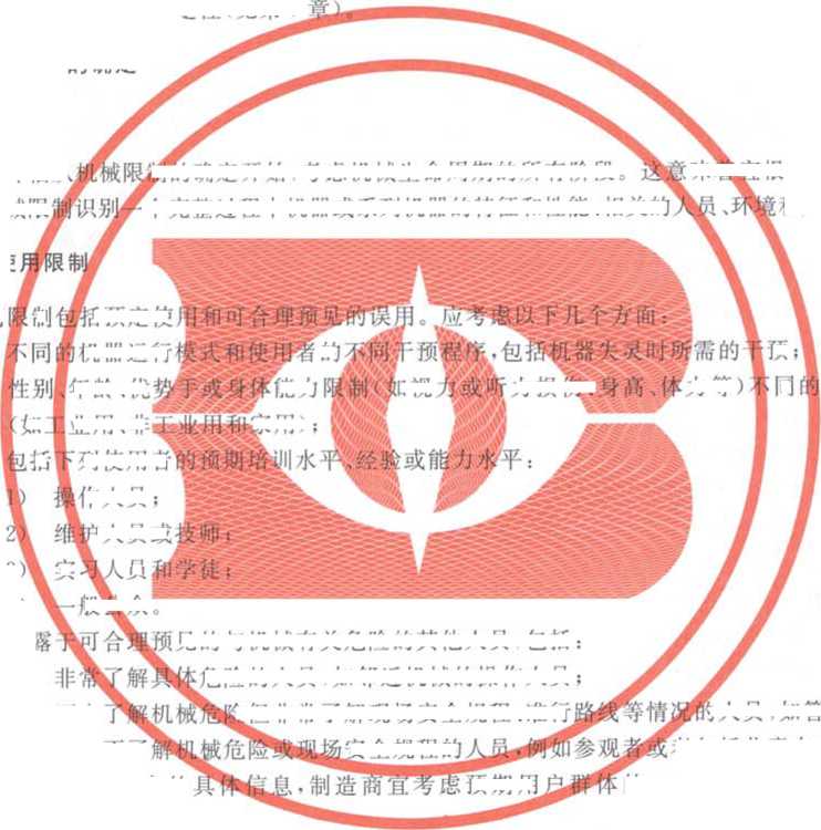 本标准的主要目的是为设计者提供总体框架和决策指南.使机械在其设计出在预定 使用范围内具备安全性的机器。本标准也为标准制定者提供一种策略∙.-∙≡ = ∑-≡i¾适当的B类标 准与C类标准。
