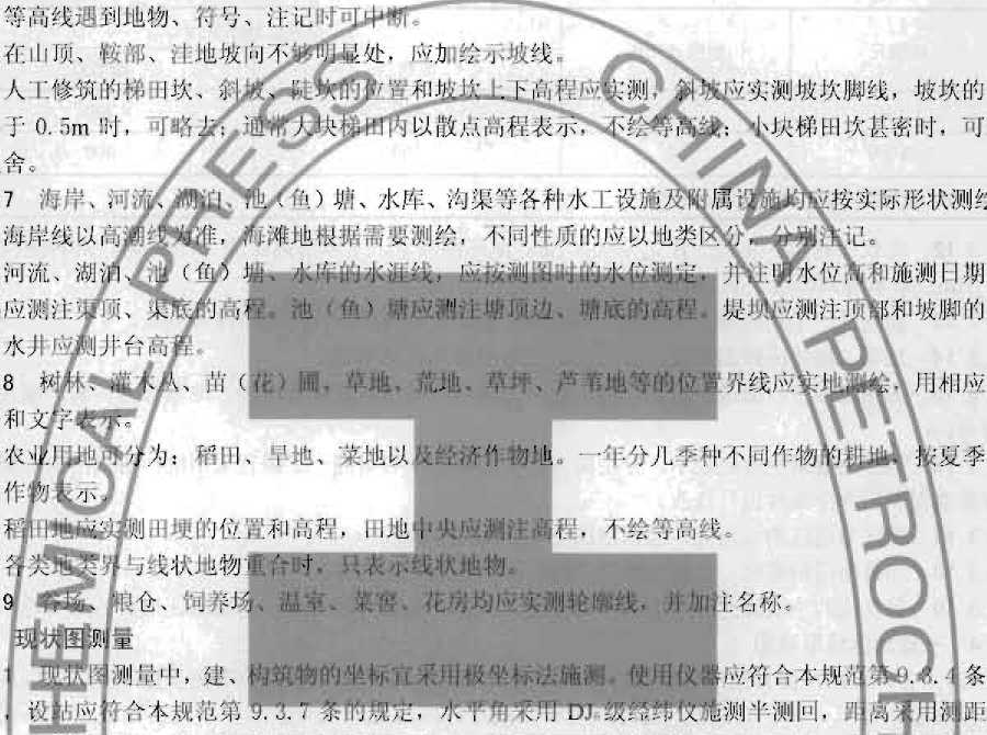 9. 5. 5 在GB/T 20257, 1—2007《国家基本比例尺地图图式第[部分:1:500、1:1000、1:2000地形 图图式》中规定:室外毗姓成群的牛产设备,只測川其范围线,配首符号,我们认为这样表町:不能准 确反应石化企业的生产特点,使用也不方便本规范规定:室外设备应逐•实测,并加注专石名称■ 9.5.6雌務的地E投影与械基础、瓏边的地类界和排水沟重合不易•一表示清楚时,可综合取舍。