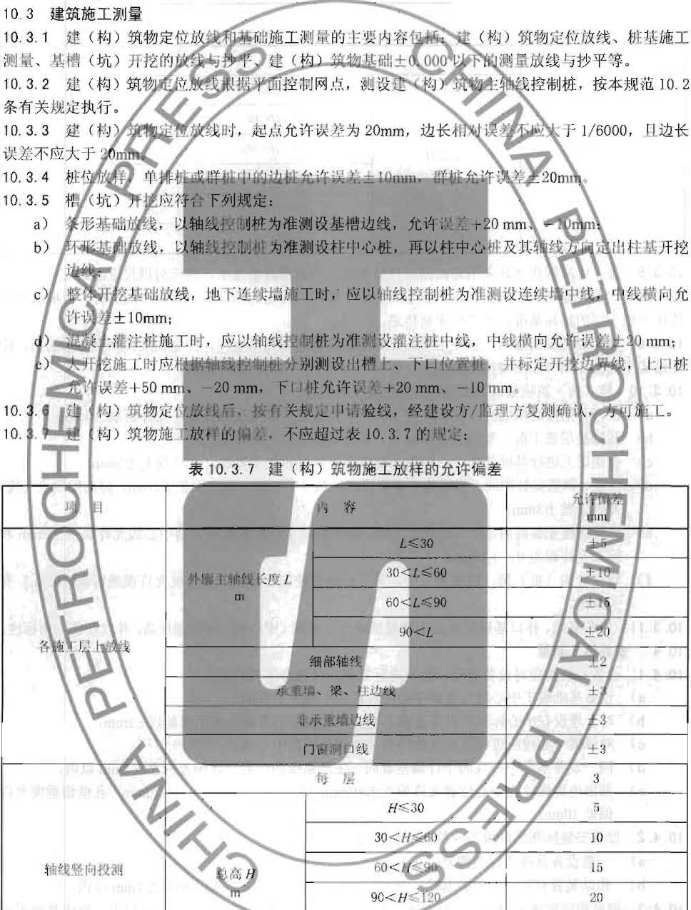 10.3. 7建(构)筑物施工放样允许偏若的规定,是依据建筑丁程各专业工程质量验收规范GB 50202〜 GB 50209等的施ZL要求限差制定的。