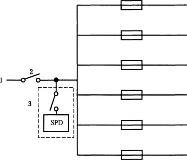 图N.1通过单独隔离开关(可安装在SPD壳体内)连接至总开关负载侧的SPD的电路图