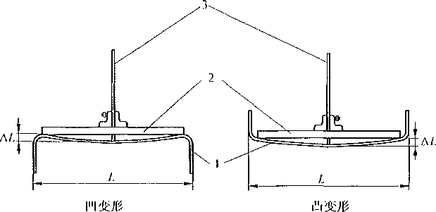 ■方法见图2。确定试验样品被测而上变形最大点后,使直尺的方向与箱M -r∣rt∣平行,」尺 平面与被测面垂直,测得直尺下端到该点的距离即为被测面的侧星变形Ift δ∕,0选丿Im尺的长. 被测面的直线长度一致。试验样品被测血的侧而变形率/1(%)按式(1 )计算。