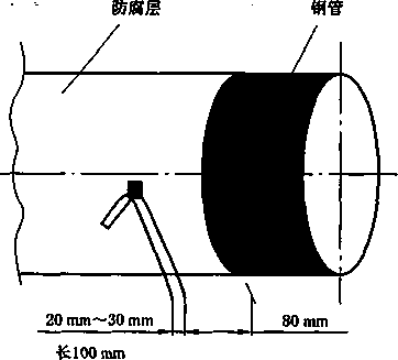K. 2.1从防腐管或补口处截取试件,补口防腐层也可按实际操作方法制作,试件的尺寸约为 350 mm×170 mmX管壁厚,其中350 mm沿管子轴向的切割长度。试件应不少于2个,用25 kV(补口 防腐层用15 kV)的直流电压进行电火花检漏无漏点的试件才能使用。