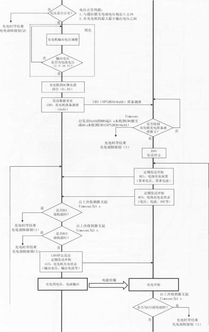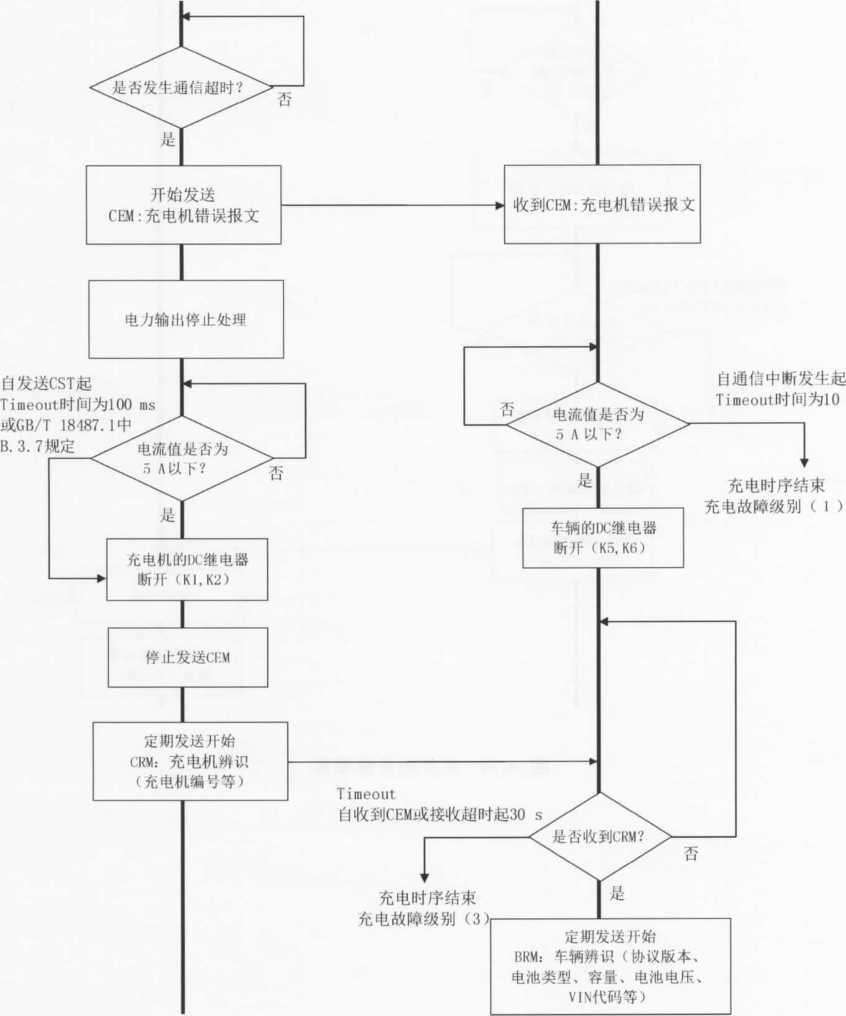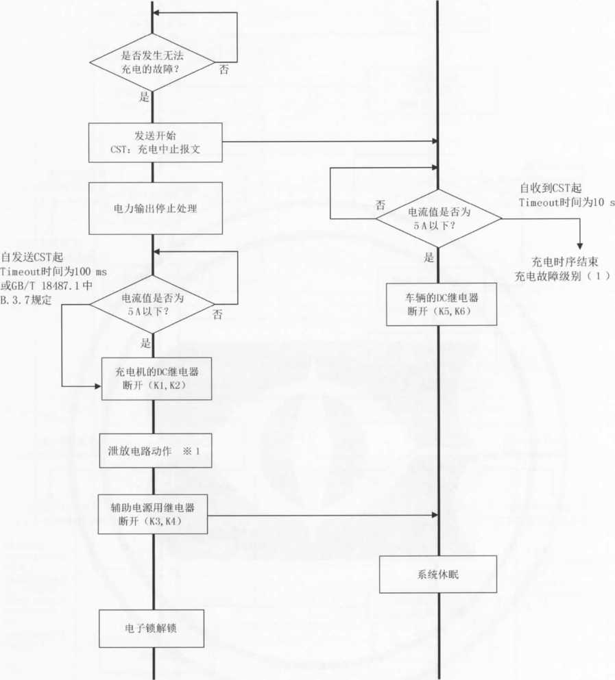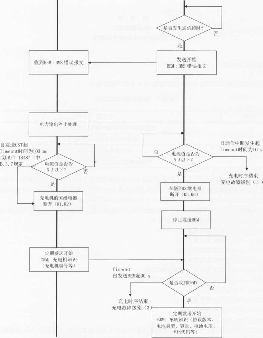 注2:当充电机检测到充电故障时,立即发送CST(充电机中止充电)命令,同时充电机停机,停止CAN通信,切断 KI、K2、K3、K4等开关,根据故障类型进入相应的处理方式。在处理方式C)下,当充电机自检到故障消除时, 重新由充电机发起握手辨识阶段的连接,进行充电。如果重新连接3次仍未成功,则按照处理方式b),需操 作人员査看当前状况并重新插拔充电连接器,尝试再次充电。