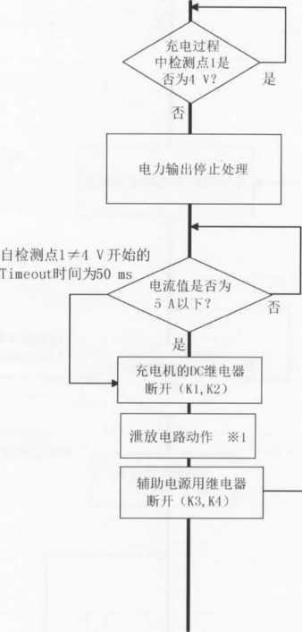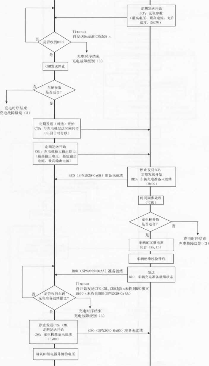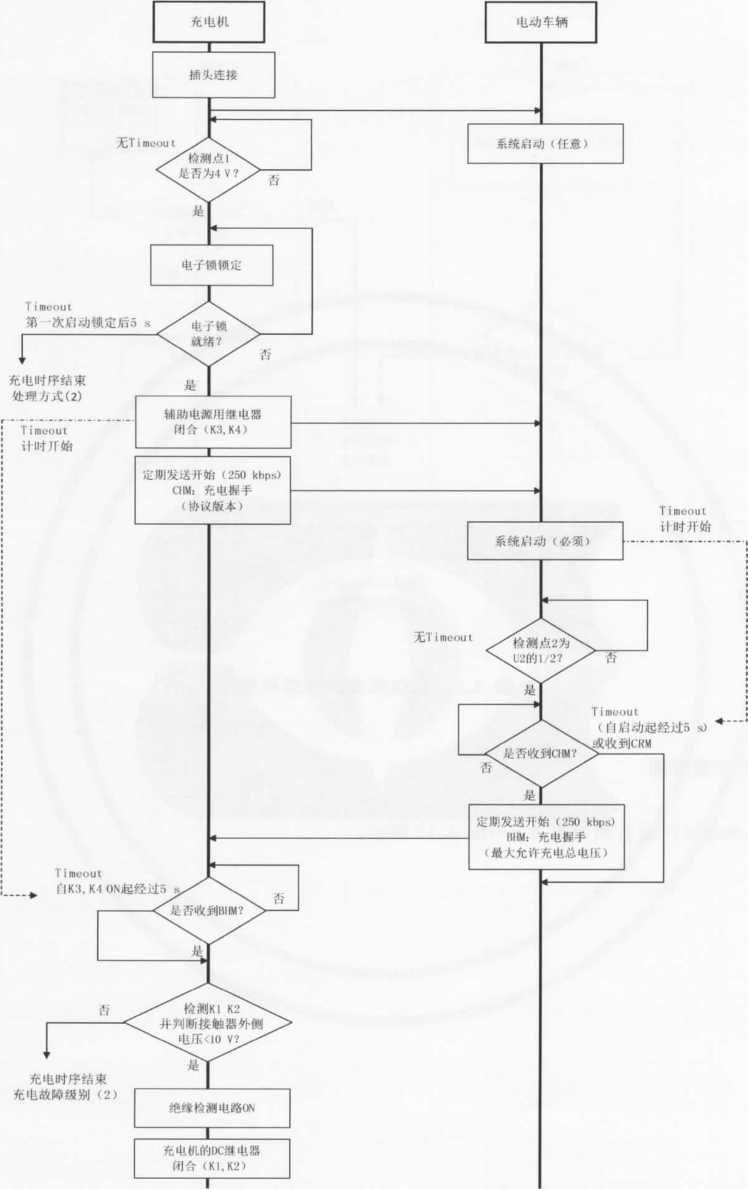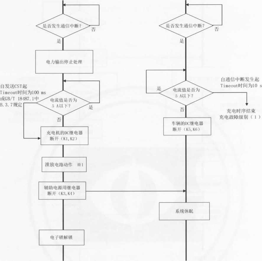 注2:当充电机检测到充电故障时,立即发送CST(充电机中止充电)命令,同时充电机停机,停止CAN通信,切断 KI、K2、K3、K4等开关,根据故障类型进入相应的处理方式。在处理方式C)下,当充电机自检到故障消除时, 重新由充电机发起握手辨识阶段的连接,进行充电。如果重新连接3次仍未成功,则按照处理方式b),需操 作人员査看当前状况并重新插拔充电连接器,尝试再次充电。