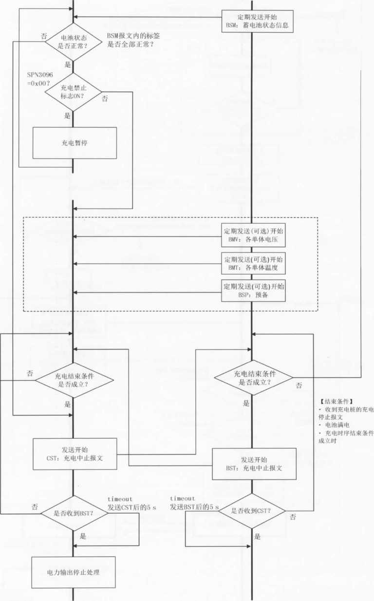 注1: BMS检测到故障后,根据故障程度,选择在BSM(动力蓄电池状态信息)报文或BST(BMS中止充电)报文中 提供停止充电信息,使充电机停机,进入处理方式b);或是将BSM报文中SPN3090〜SPN3095均置为00(电 池状态正常),且SPN3096置为00(禁止充电),使充电机暂停输出电流,此时BMS和充电机进行正常通信,直 到等待BMS发送的BSM报文中SPN3096为01 (允许充电)后,重新允许充电机电流输出,如果等待时间超过 10 min,充电机中止充电,并保存中止充电原因。