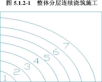 5.1.2整体分层连续浇筑施工或推移式连续浇筑施工是目前大体积混凝土施工 中普遍采用的方法,本条文规定了应优先采用。工程实践中也有称其为“全面分 层、分段分层、斜面分层”、“斜向分层、阶梯状分层”、“分层连续,大斜坡薄层 推移式浇筑”等,本条文强调整体连续浇筑施工,不留施工缝,确保结构整体性 强。