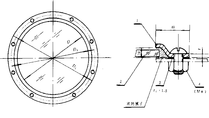 1—窗框;2 —玻璃;3—垫片;4一螺栓