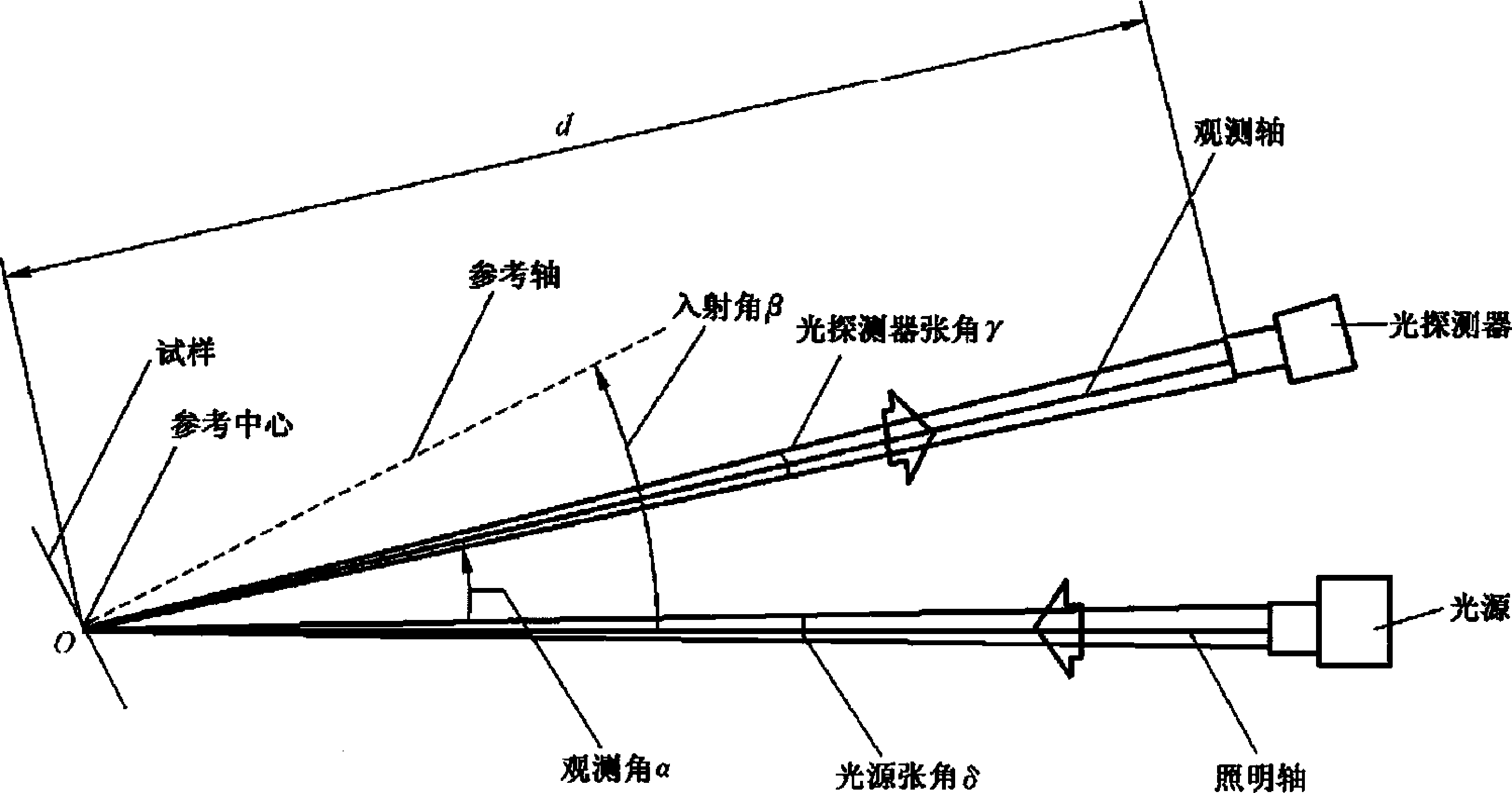试样参考中心对光源孔径张角及对光探测器孔径张角应分别不大于12\试样整个受照区域内的 垂直照度不均匀性小于5%,试样参考轴相对于光源轴的入射角耶)应能在0o-40°范围内变化。观测轴 相对于照明轴之间的观测角J)应能在0.2°〜2°范围内改变。