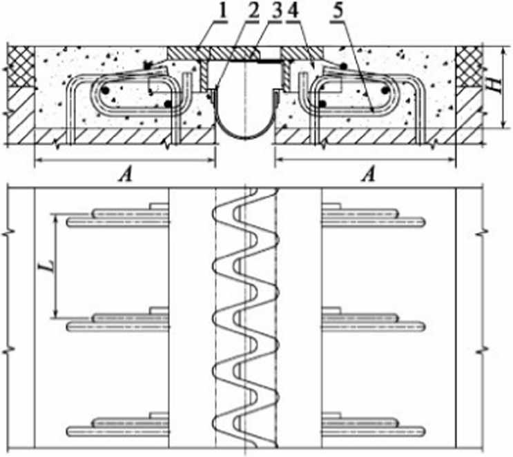 伸缩装置由带肋梳齿板、防水橡胶条、不锈钢板、锚板、环形锚筋等部件构成。悬臂式结构示意见