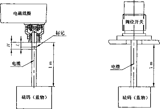 B.6.2试验方法见图B.1,通过实验工装将电缆引入口向下放置,电缆呈铅直状态,长度1 m,末端下坠 硃码(重物)使电磁线圈电缆承受向下拉力(以N为单位),为圆形电缆时,20倍芯轴或电缆直径(以mm 为单位);为非圆形电缆时,6倍电缆周长(以mm为单位)。并在夹紧装置出口端做上水平线装标记,测 量标记到出口的距离LA h后再次测量标记到出口的距离H,要求H-L≤β mm O