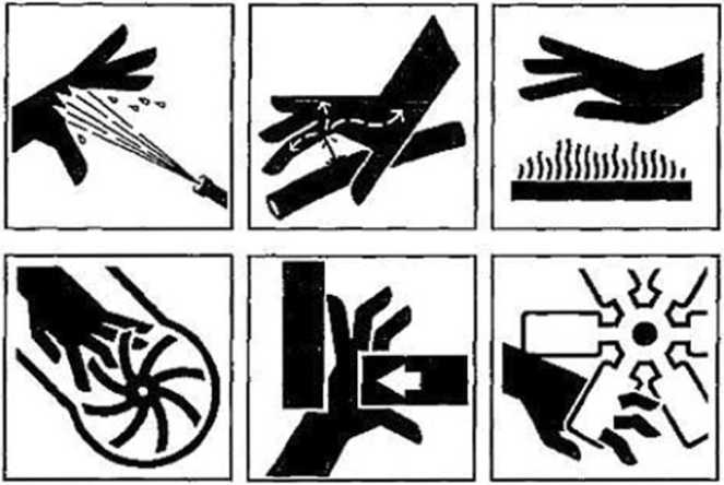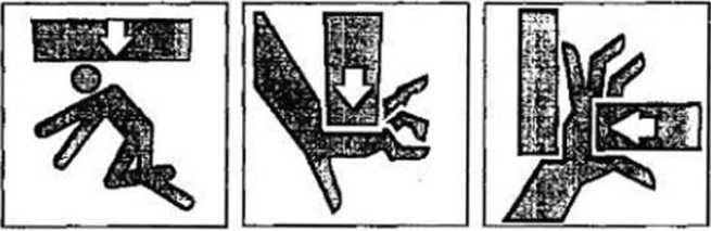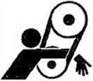 有关乎骨、手城头部的危险可通过所冇上半身而不是全身视图得到最好的表現.通常情况下,上半 身为侧视并旦头部也为测视图而菲正视图或圆形.上半身侧视图也能有效表达危险运动的方向.如 D.S.2所示,如果手与危险相关或者如果通出手会冇助于视觉表达,应在图上Bi出F・图D.6给出了 上半身危险图形符号示例.
