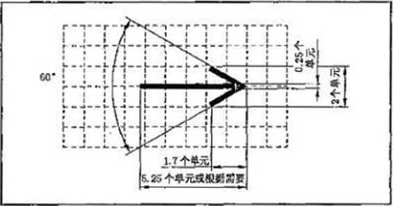 该箭头一般使用在避免危险图形符号中,X寸于带文字安全标志采用白底黑色箭头,对于无文字安金 标志采用黄底黑色箭头.箭头各部分尺寸见图n. 24.眞然对于个别图形符号来说,箭头尺寸可以做• 甦变动,但通常应按fflD. 24所示实际尺寸的60%绘出.除了将篱个箭头的尾部相接外,诙箭头还应符 合ISO 4196中有关为人指路的公众信忌符*的运动方向箭头的規定.图D. 25给出了用箭头表示与 危险保持安全距离的图形符号示例。