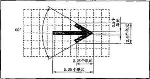 ~般使用白底黑色箭头,该箭头可以足直的、斜的或者弯曲的.倚头各部分尺寸见图D.20.虽然 对于个别图形符号,箭头尺寸可以做一些变动,但通當应按fflD. 20所示实际尺寸的100%绘出。该箭 头应符合ISO 4196中規定的运动方向箭头,箭头头部央角为60°.图D. 21给出了使用箭头表示整机 运动方向的危险图形符号示例.由于图D.18和图D. 20所示箭头的唯一阪要的区别就是线条的相对 粗细程度,因而两种箭头几乎完全相同.可能的话,用图D. 18中的带头表示机器部件的运动方向,而 图D.20中的箭头表示凝机這动方向.