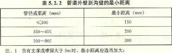 5”∙∙2沟槽开挖应保UT.®VL和边坡的稳定,井应留有足够的澈 -「.空间.管渠外壁到沟壁的净距不应小于表5. 2.2的规定。