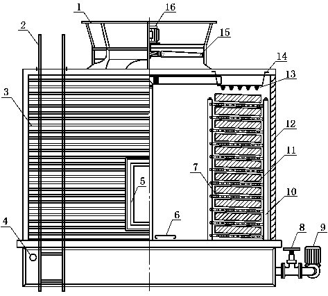 闭式塔的典型结构形式有逆流、横流和复合流三种。逆流闭式塔示意图如图1所示;横流闭式塔示 意图如图2所示;复合流闭式塔示意图如图3所示。