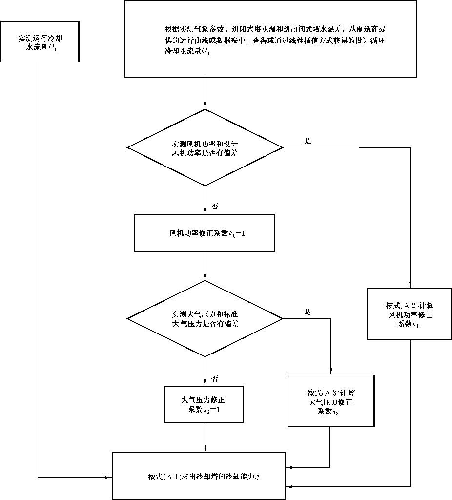 按A.4.3的相应仪器测定循环冷却水流量o 风机电动机工作电流及输入有功功率。