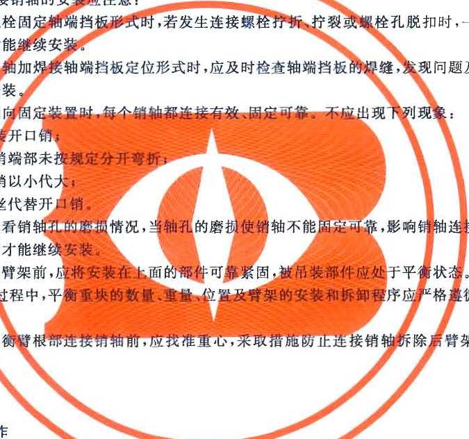 7.3安装时,各部件之间的连接件和防松元件(如销轴、螺栓轴、轴端挡板、开口销、钢丝绳夹、钢丝绳楔 形接头等)应齐备并连接可靠。