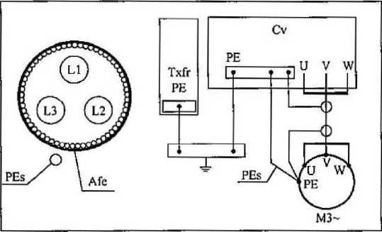 3利用钢或镀锌铁绞线作屏蔽/铠装的三芯电缆及其连接方 式见图6,其中Afe为钢带铠装,Txfr为变压器,Cv为变频器, PES为独立的接地线。如果屏蔽层的横断面不够大,需另加一独 立的接地导体。