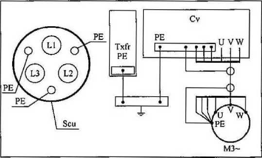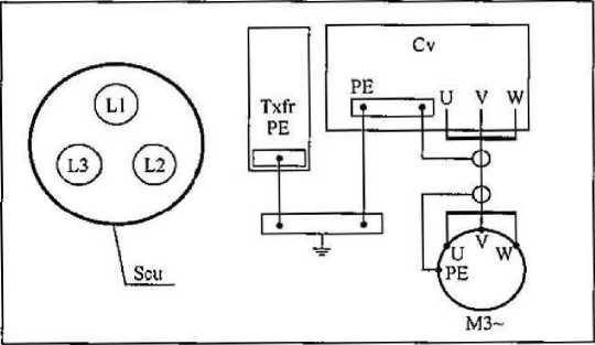 1 带一同心的铜或铝防护层的三芯电缆及其连接方式见 图4,其中SCU为同心铜(或铝)屏蔽,Txfr为变压器,Cv为变频 器。各相线彼此等距且与屏蔽层等距,屏蔽层作为防护导体。