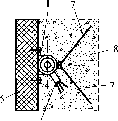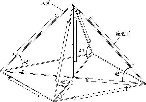 目前使用的应变计组结构方式难以保证仪器安装的角度 和方向,虽然规定角度不可超过±1° ,但在现场埋设时,特 别在回填混凝土和振捣后,仪器的安装角度很难保证,又没有 有效的方法来检验,因此规定的角度误差实际上是一句空话。 为此,有许多单位对应变计组的组合方式提出了改进方案。图 8-1所示的应变计组新组合是其中的一种,其优点是可以比较 好地保证应变计的埋设角度和方向,适用于单向、二向、四向、 五向、七向和九向等应变计组。这种组合只是调换45°和 135°仪器的位置,不改变其方向。由于在大体积混凝土中, 应变组被认为是一个点,仪器的位置改变不会影响点应力的测 量,因此新型应变计结构仍可按原有的公式和方法进行数据处 理和计算应变、应力。