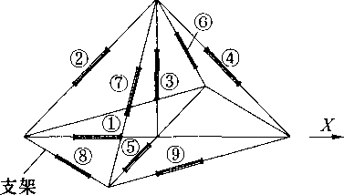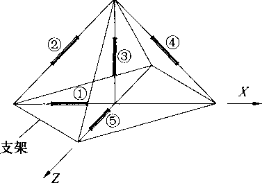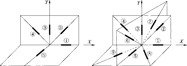 为了方便今后整理监测资料和计算应变、应力,在应变计组 安装埋设时就应该确定应变计组的坐标和组内每支仪器的编号。 从监测资料整理计算方便的原则出发并结合多数工程的习惯,两 种应变计组合的坐标和编号规定如图8-2、图8-3所示。