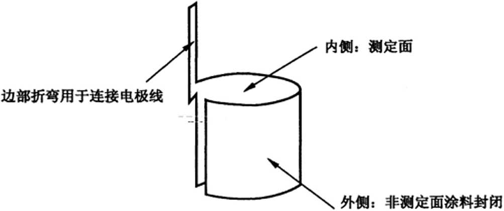 来样剪切为150 mmX200 mm,用棒涂的方式将非检测面用涂黄涂料封闭,然后在185°C下烘烤 10 min左右将涂层烘干。将封闭后的样品裁剪为30 mm X 110 mm,然后准确裁剪为30 mm X 100 mm,边部预留30 mm×10 mm用于折弯后连接电极线,见示意图F.lβ裁剪后的样品用酒精棉球 清洁试样待测面,自然晾干。沿试样长边方向对试样进行弯曲,使试样待测面朝内绕成圆筒状,见示意 图F.2。