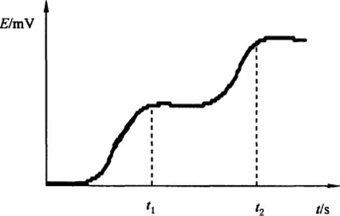 在电解曲线上第一个突跃点为游离锡电解时间釘(单位为s),第二个突跃点为总锡电解时间:2(单 位为s)。