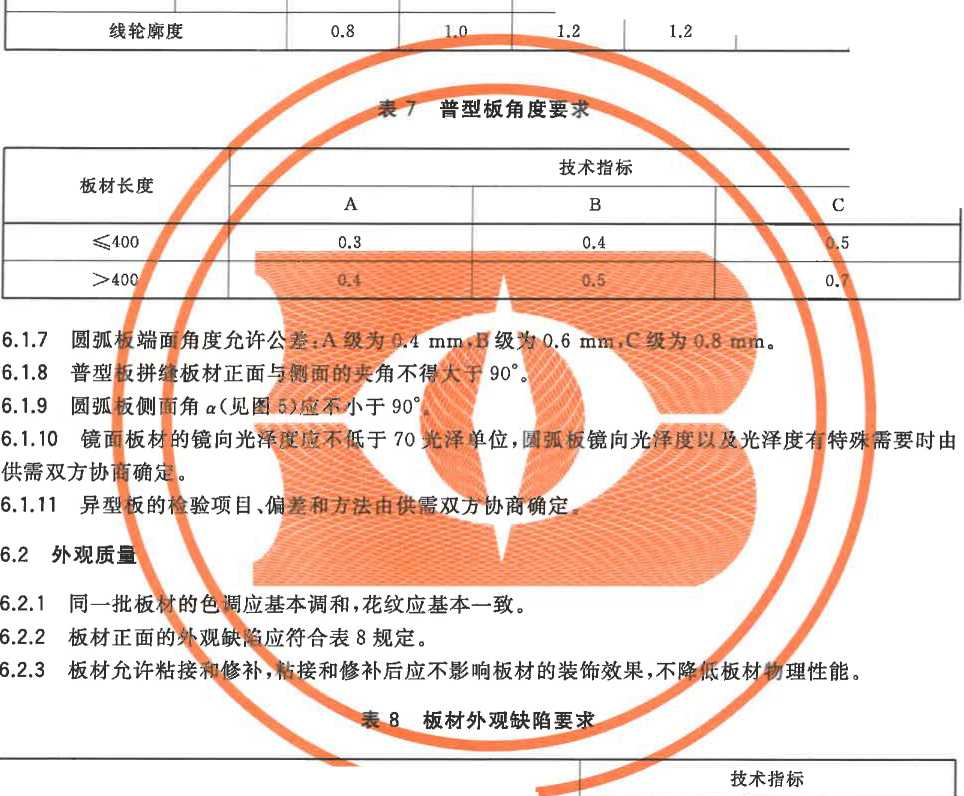 b) 普型板为规格尺寸偏差、平面度公差、角度公差、镜向光泽度、外观质量;