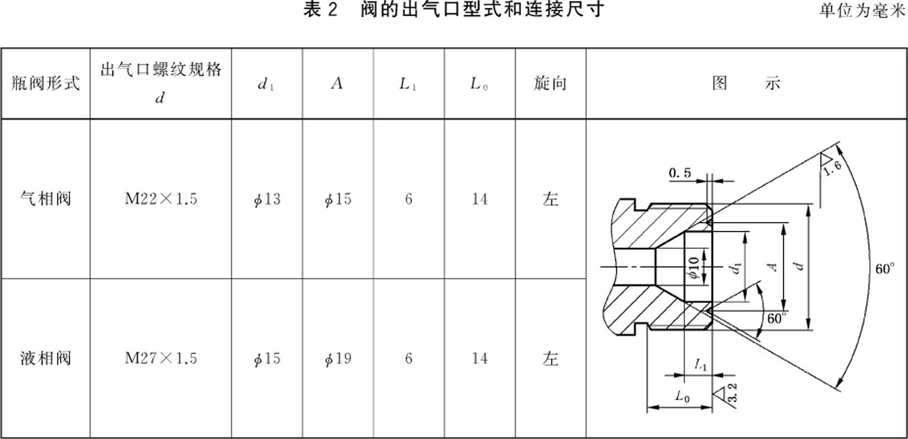 5.3 阀的进气口螺纹分为两种规格。用于气相润上的螺纹为PZ27.8-LH.用于液相润上的螺纹为 PZ39.O-LH,其螺纹尺寸和制造精度应符合GB 8335的规定。