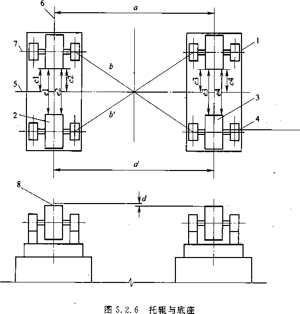 5.2.1本条强调混合机设备安装前应设置安装的基准线。混合 机安装的基准线一般有混合机底座的横向中心线、纵向中心线及 托跟轴向中心线。混合机的纵向中心线即筒体的轴向中心线;混 合机底座的横向中心线与混合机纵向中心线相垂直,即托辗的径 向中心线及大齿轮的径向中心线;托辗轴向中心线与底座纵向中 心线平行。