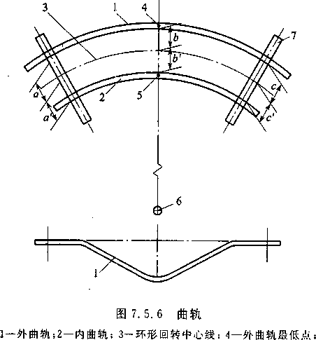 7.5.1~7.5.6由于环式冷却机的轨道(水平轨、侧轨和曲轨)安 装质量对台车和环形摩擦传动装置的平稳运行有较大的影响,是 环式冷却机最关键的工序。所以轨道安装应符合本节的规定。